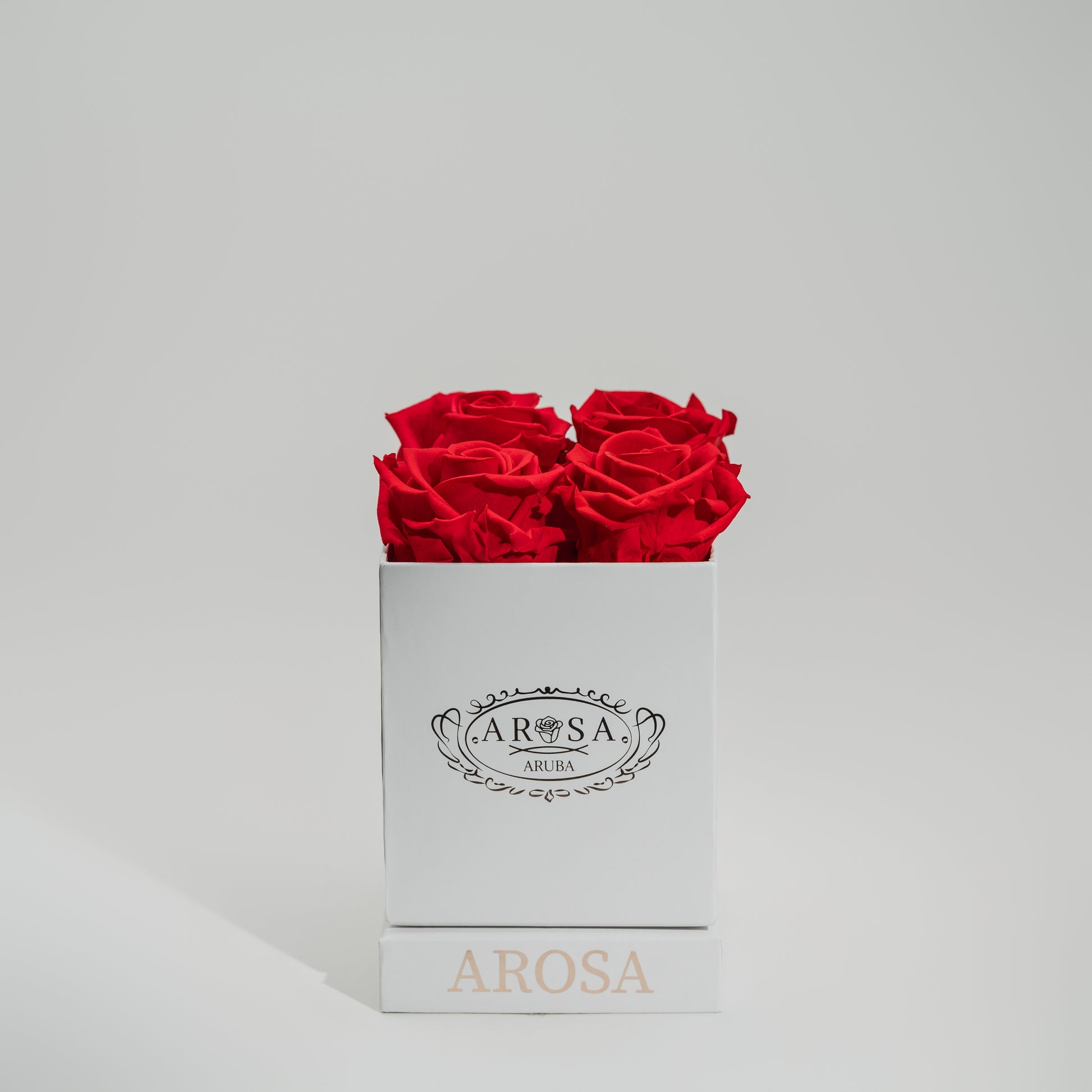 An arrangement featuring four preserved roses that sits in our beautiful small square box with a lid for decoration.